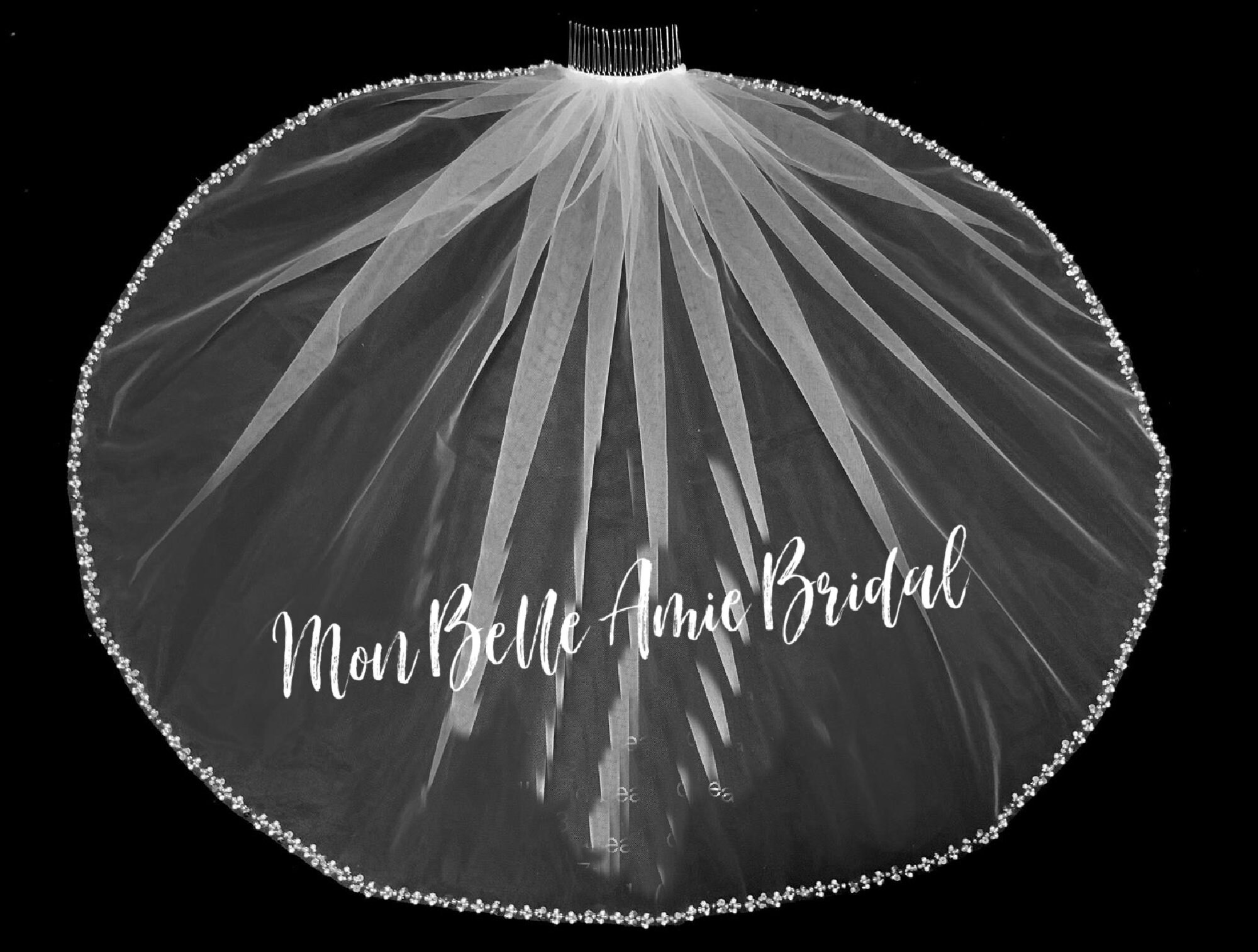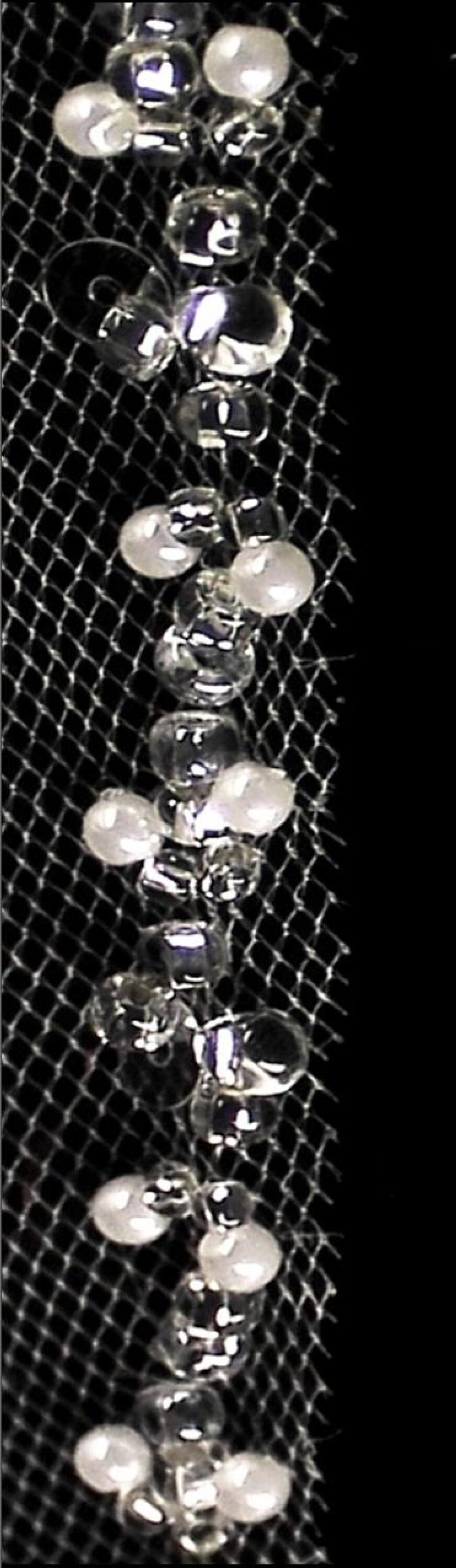 Hand sewn round beads, pearls and sequins along edge. 23 inches long by 54 inches wide. Available in white, diamond white and ivory