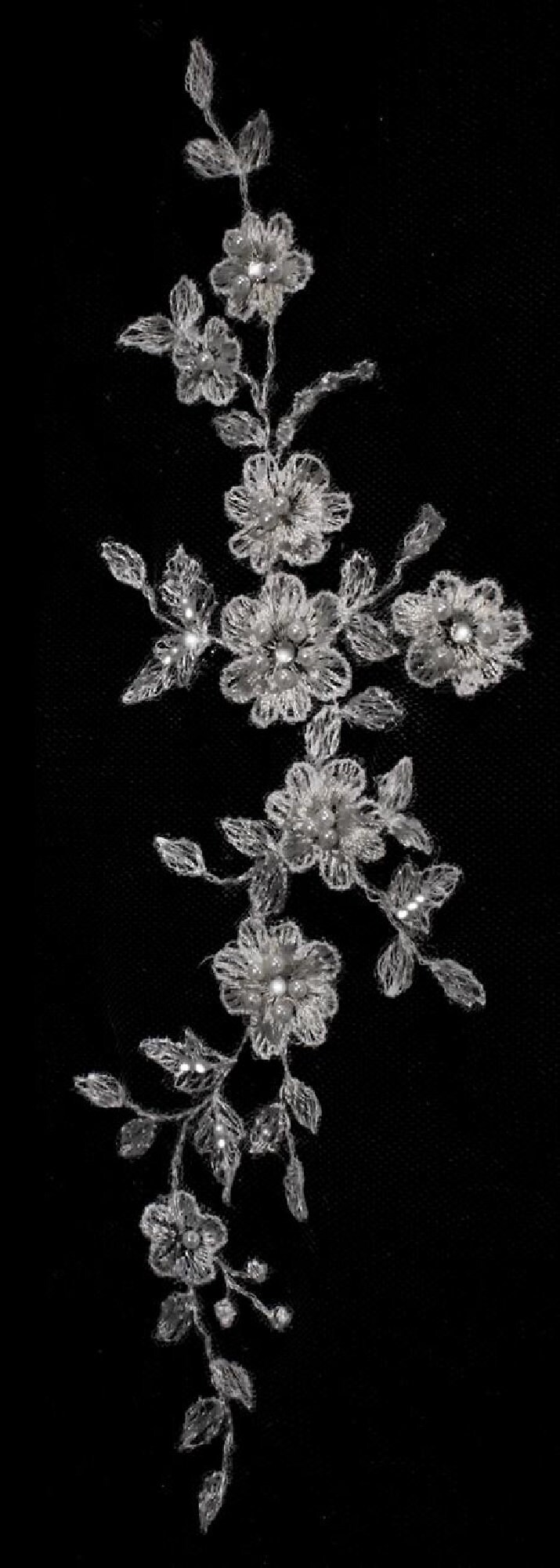 Romantic floral design lace child veil with rhinestone and pearl accents. Hemmed edge. It is 23 inches long by 54 inches long and available in white only.