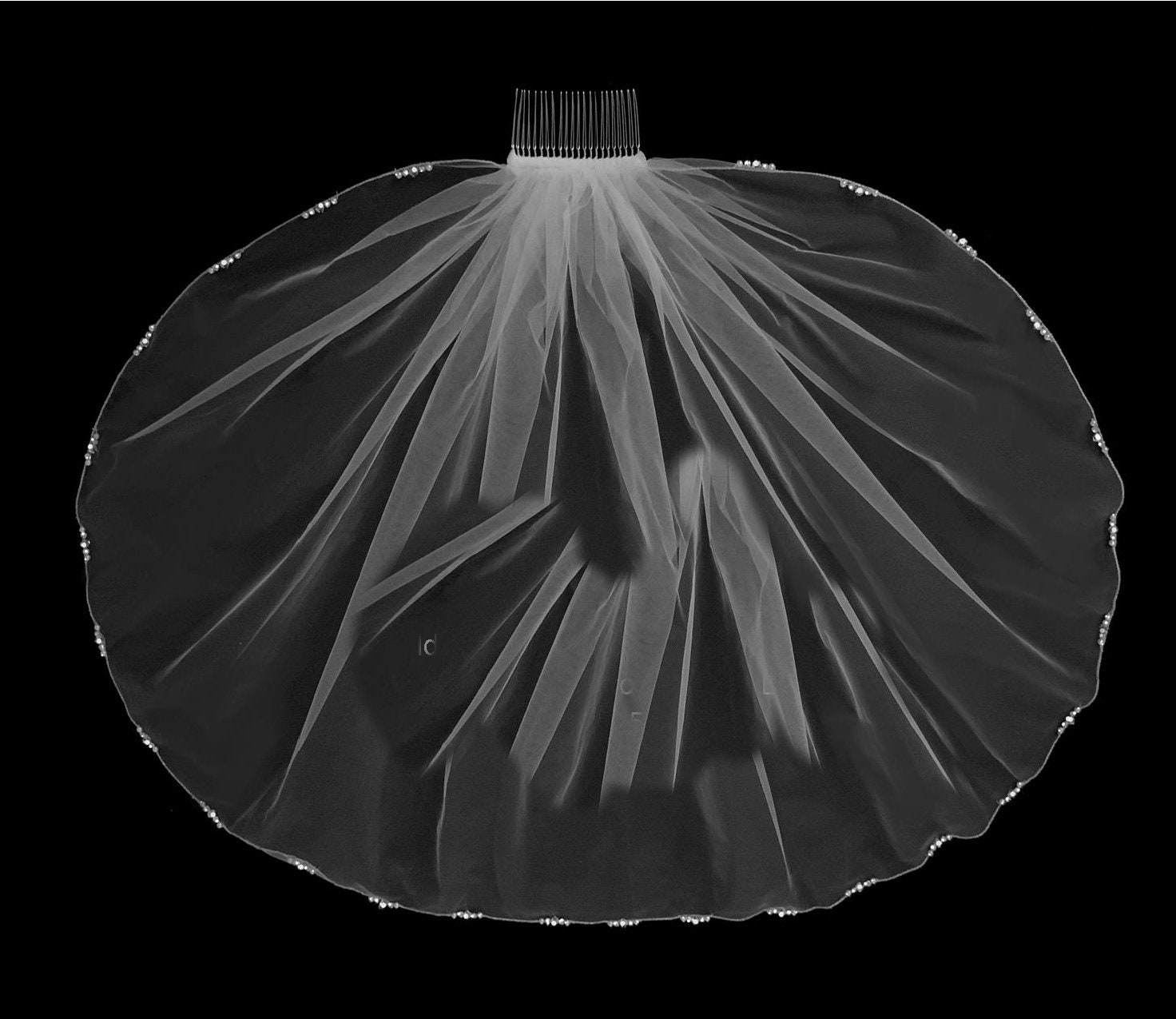 Child veil. Silver edge veil with pearls, crystals and rhinestones. It is available in white, diamond white and ivory. It is 23 inches long and 54 inches wide.