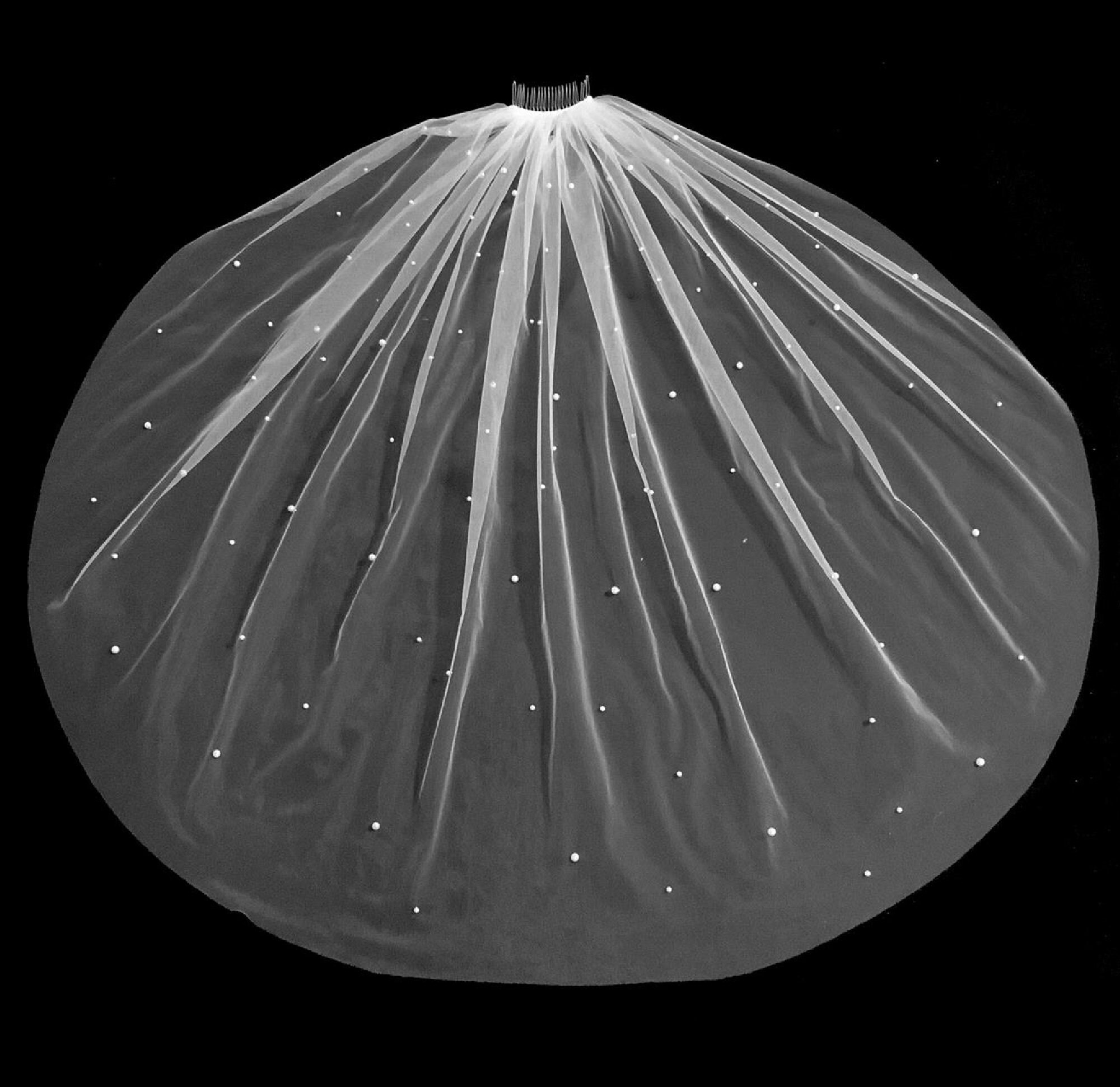 Fairytale child veil with scattered pearls of varying sizes. Available in white, diamond white, ivory, champagne. It is 23 inches long and 54 inches wide.
