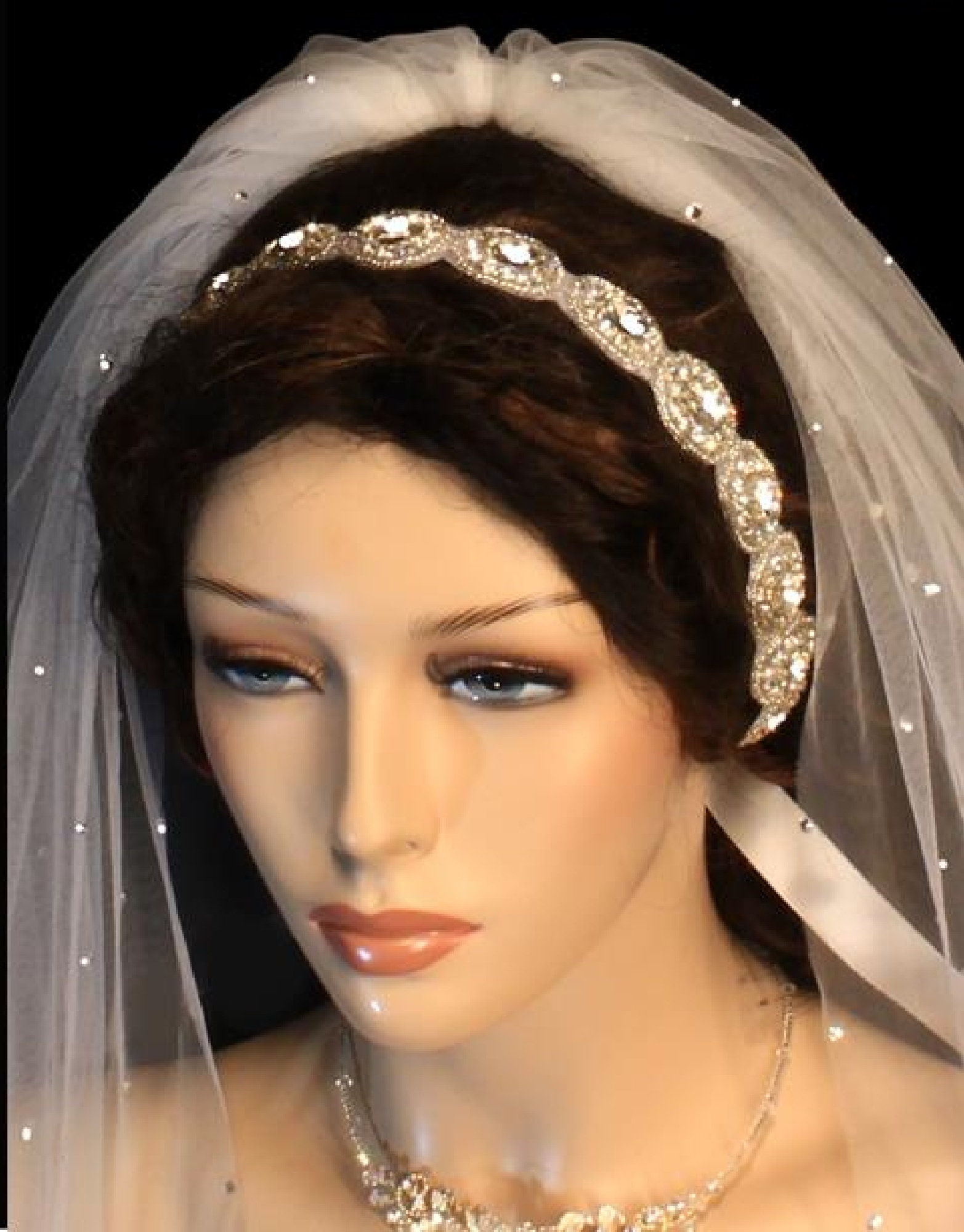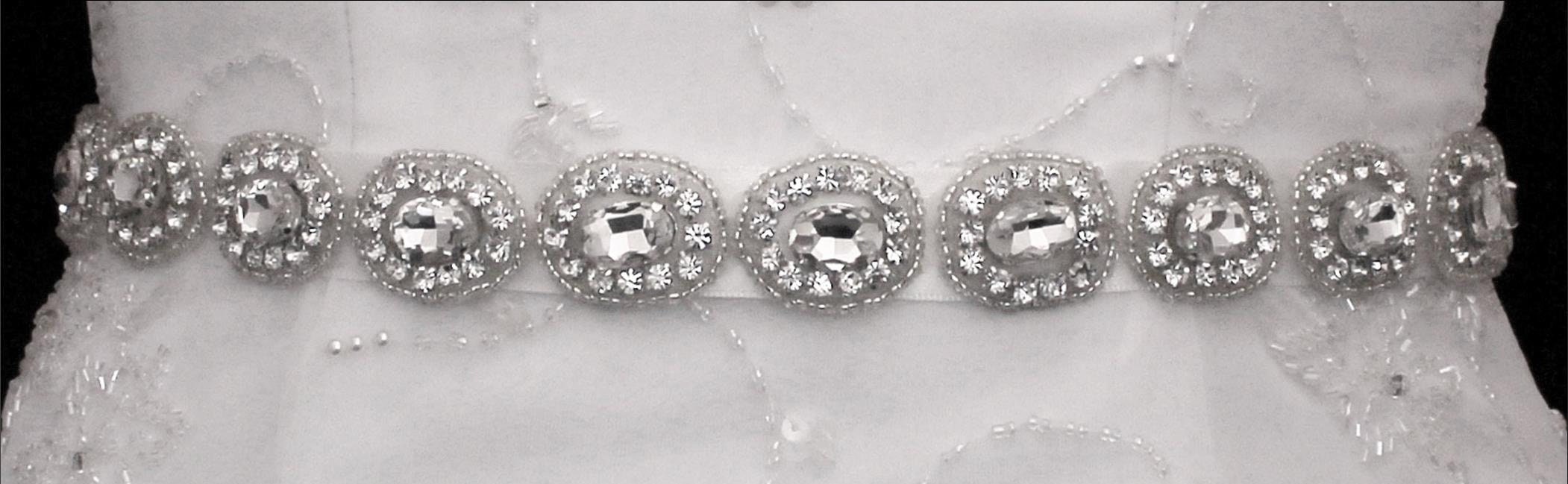 Medallions with large oval rhinestones at center, with double ring of rhinestones and shiny seed beads. Its 1 inch high and 17 inches long on a satin ribbon making the total length 70 inches long. It can be used as a belt or a headband. It can have white or ivory ribbon attached.