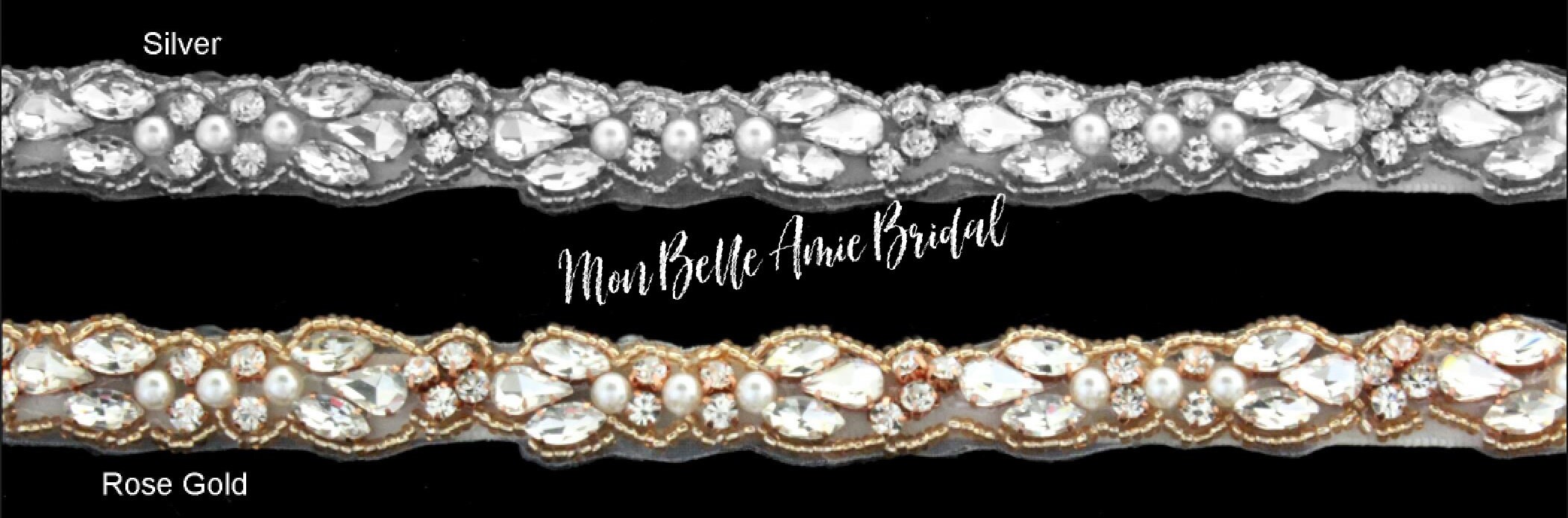 Marquise rhinestone and pearl fashion belt. The standard size is 18 inches by .75 inches on a white or ivory ribbon, making a finished length of 70 inches. The extra long belt is 36 inches long by .75 inches wide and does not come on a ribbon.
