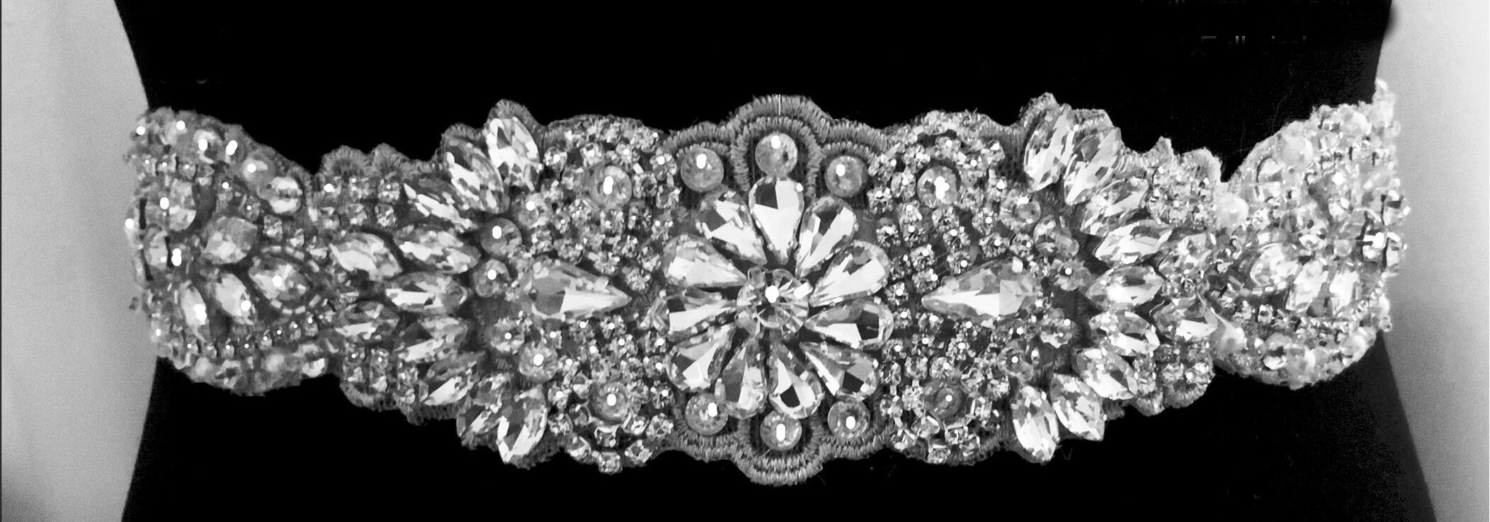 Silver embroidered sash belt with verious styles of rhinestones and pearls on a white or ivory ribbon making total lengths 70 inches. One variation measures 18 inches by 1.75 inches decorated area and the extra long one measures 33 inches by 1.75 inches decorated area.