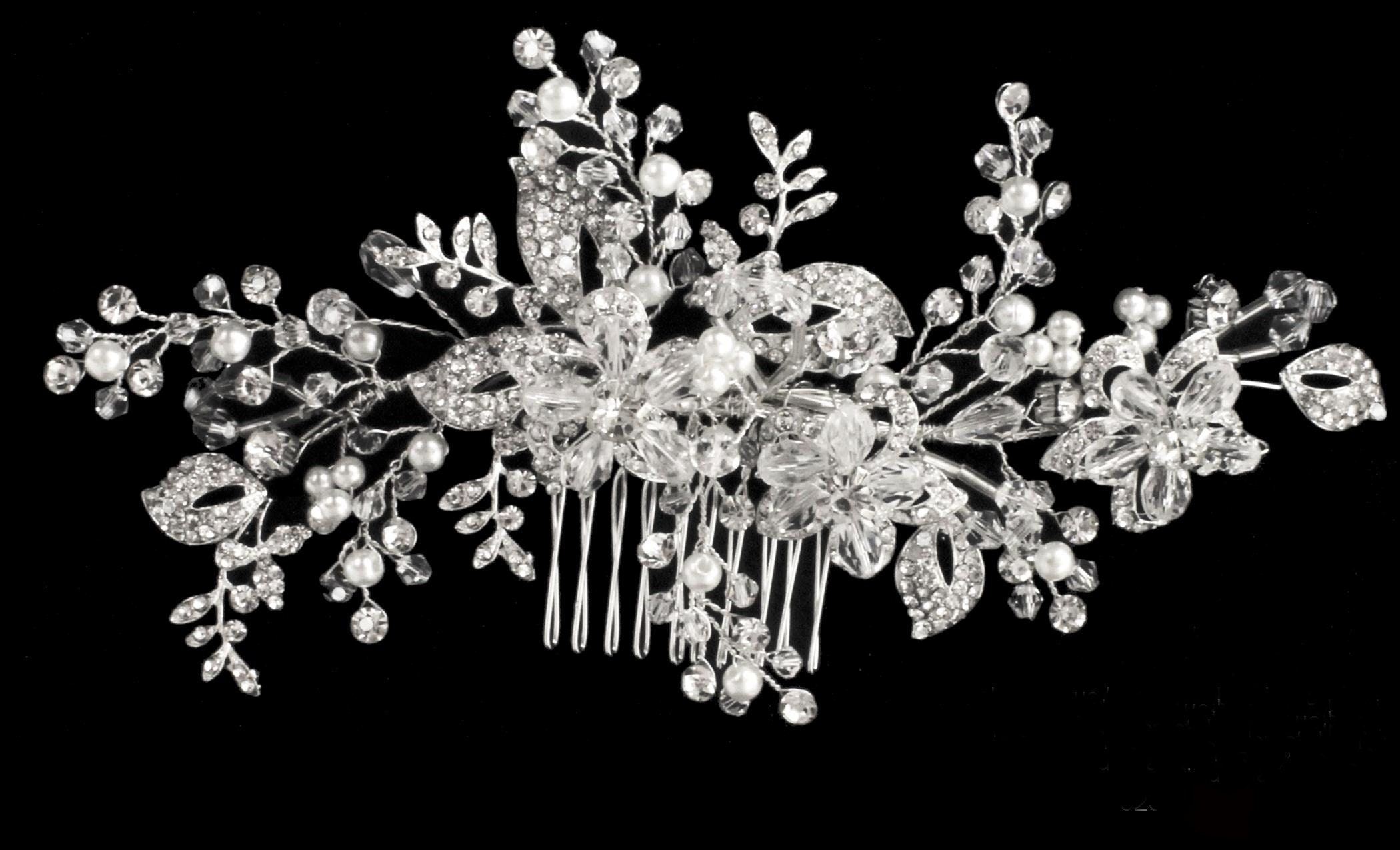 Luxurious large comb of intricately laid florals of crystals, rhinestones and pearls. 6.5 x 3 inches