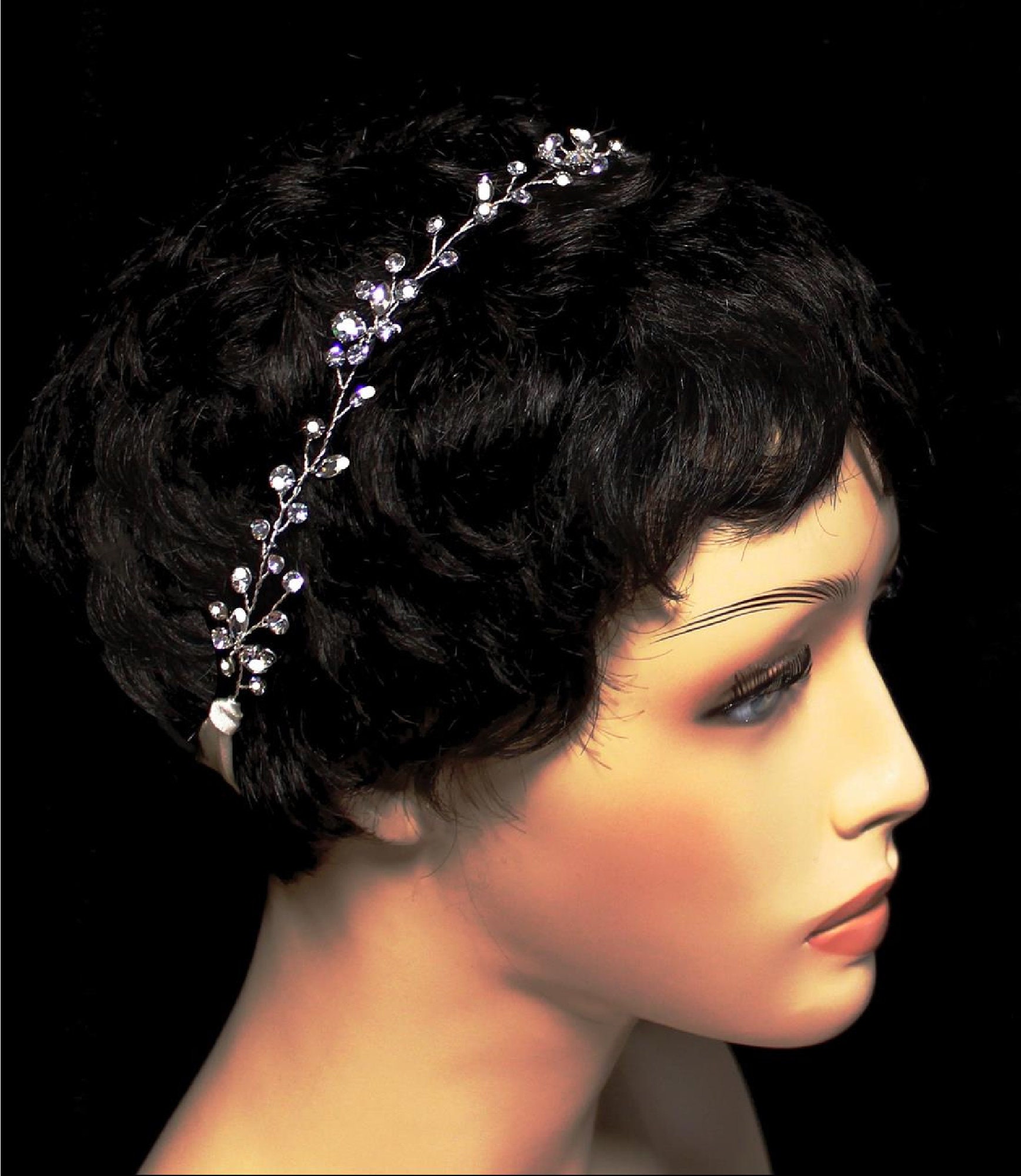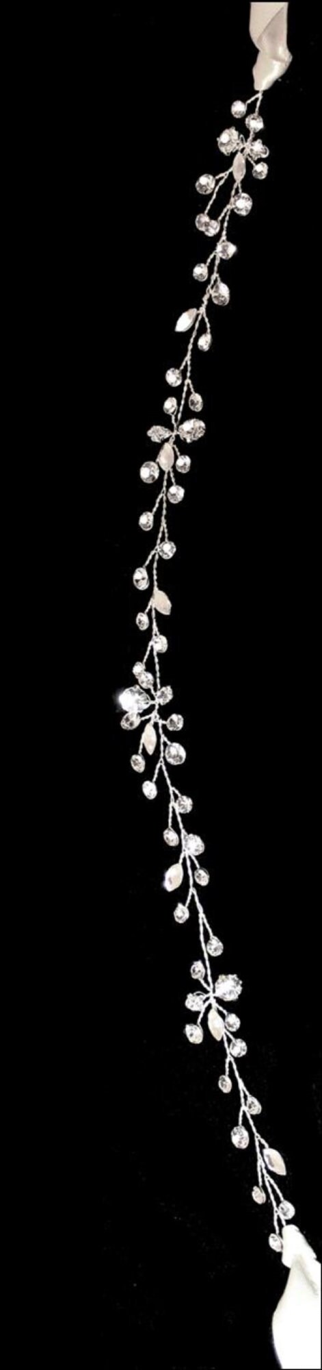 Pliable hand wired thin belt or headband. 12 inch design area. There is satin ribbon, either white or ivory, on each end to make a total length of 36 inches.