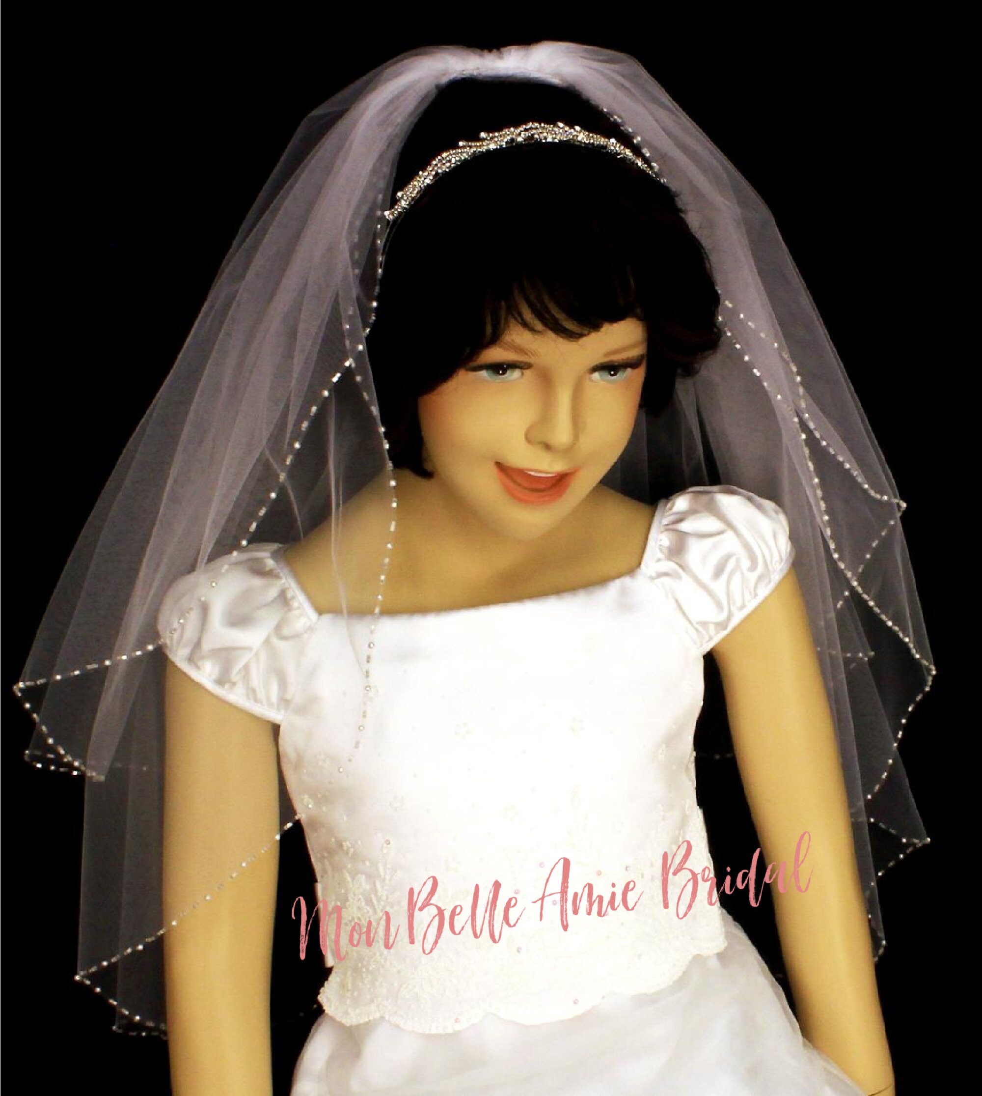 Bugle beads and tiny pearls along edge. It is available in double or single layer. It is also available in white, ivory, diamond white or champagne. 25 inches long by 54 inches wide.