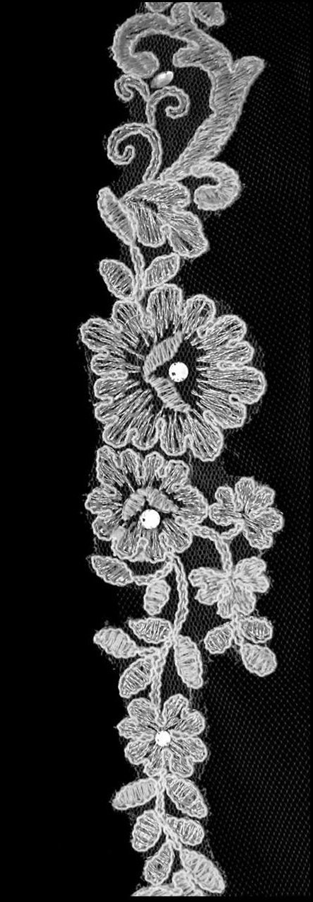 Attractive French lace veil accented with rhinestones. It is available in white and ivory and measures 23 inches long by 54 inches wide.