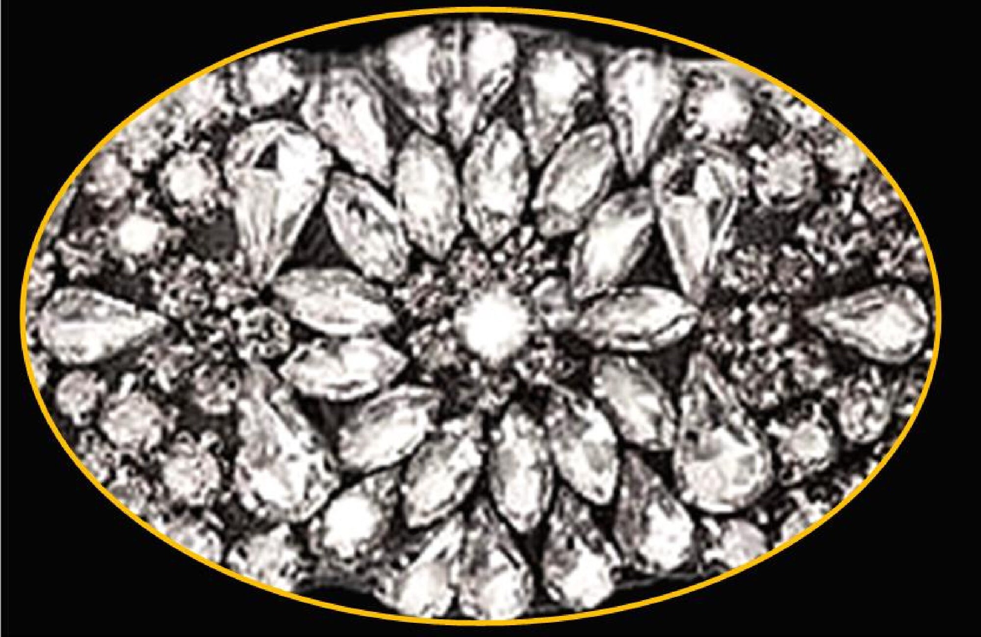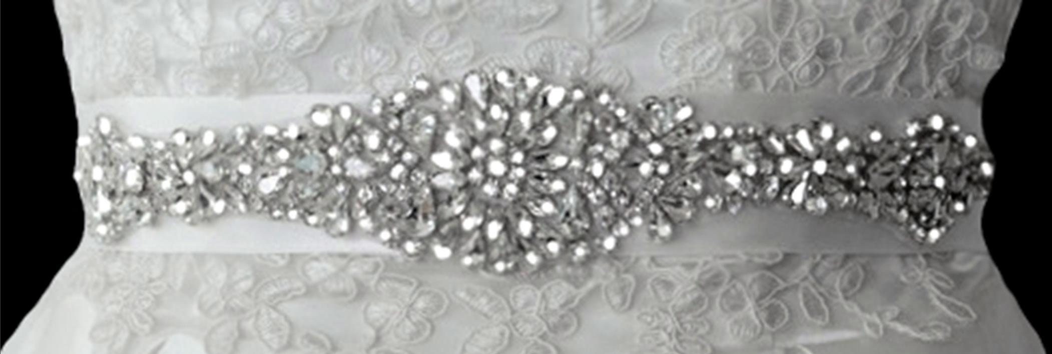 All rhinestone fashion belt with teardrop rhinestones and marguis flowers. The design is 2 inches tall at it's highest and is 12 inches long attached to a white or ivory ribbon making the total length is 63 inches.