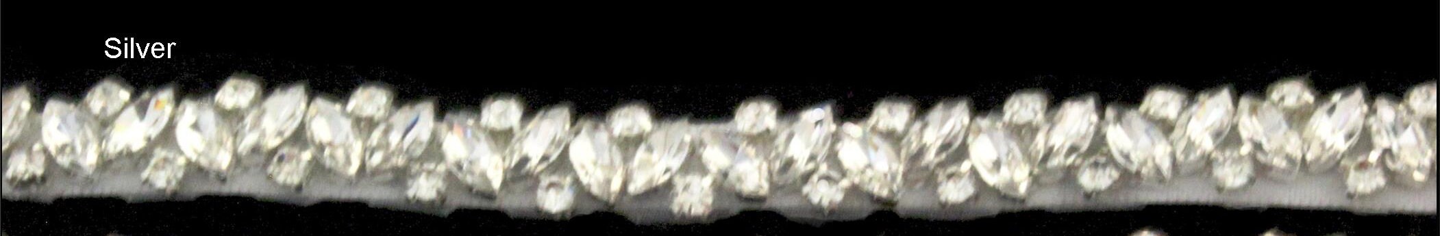 Marquise rhinestones with round scattered crystals. The regular length is 18 inches by 1/2 inch and comes on a white or ivory ribbon making the total length 70 inches. The extra long variant is 36 inches long and does NOT come on a ribbon.