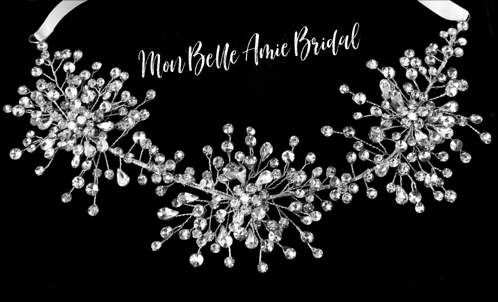 Charming three-cluster handwired rhinestone soft band. Ribbon on both ends for a total length of 70 inches. The design area is 12.5 x 2.75 inches