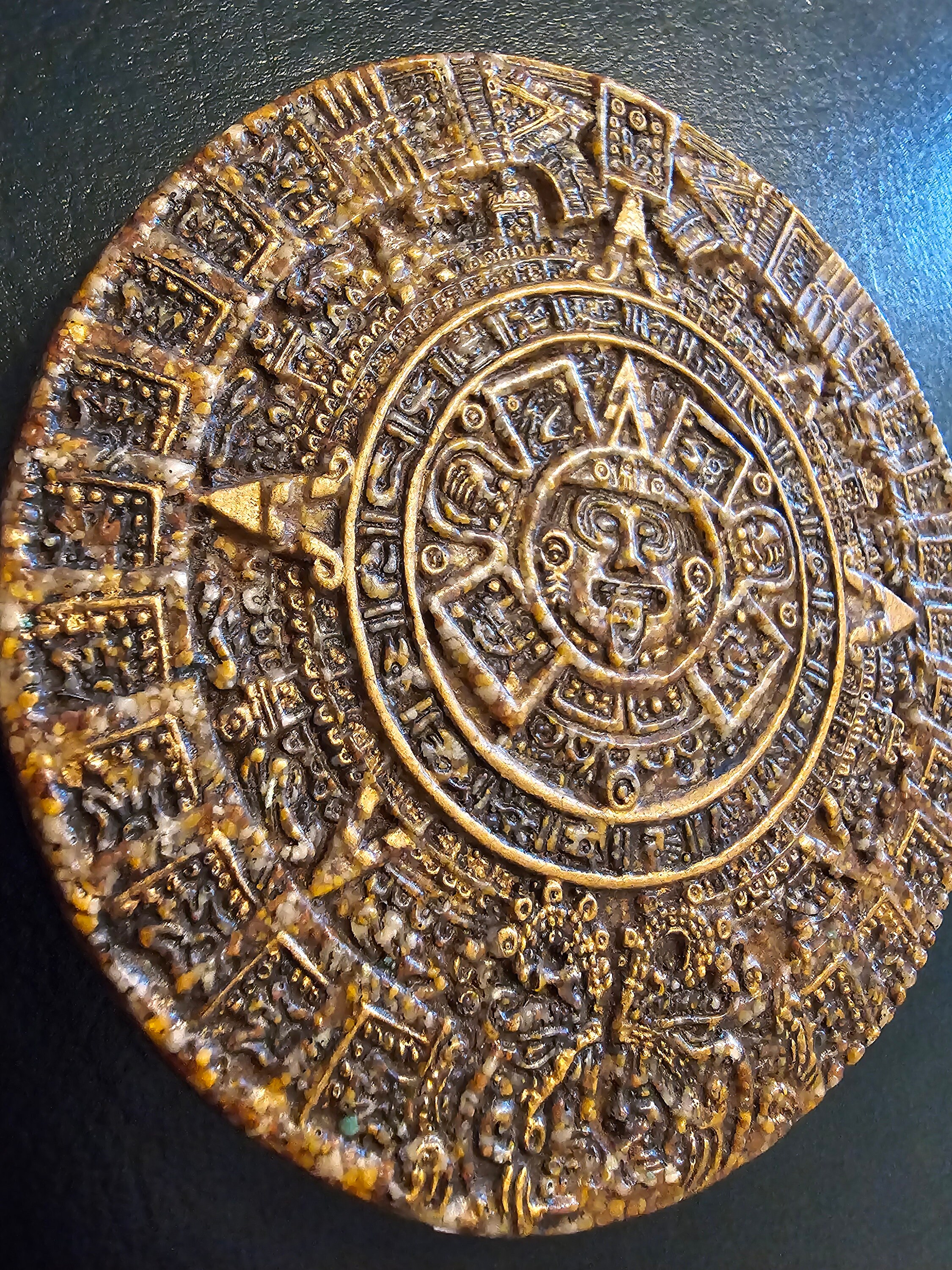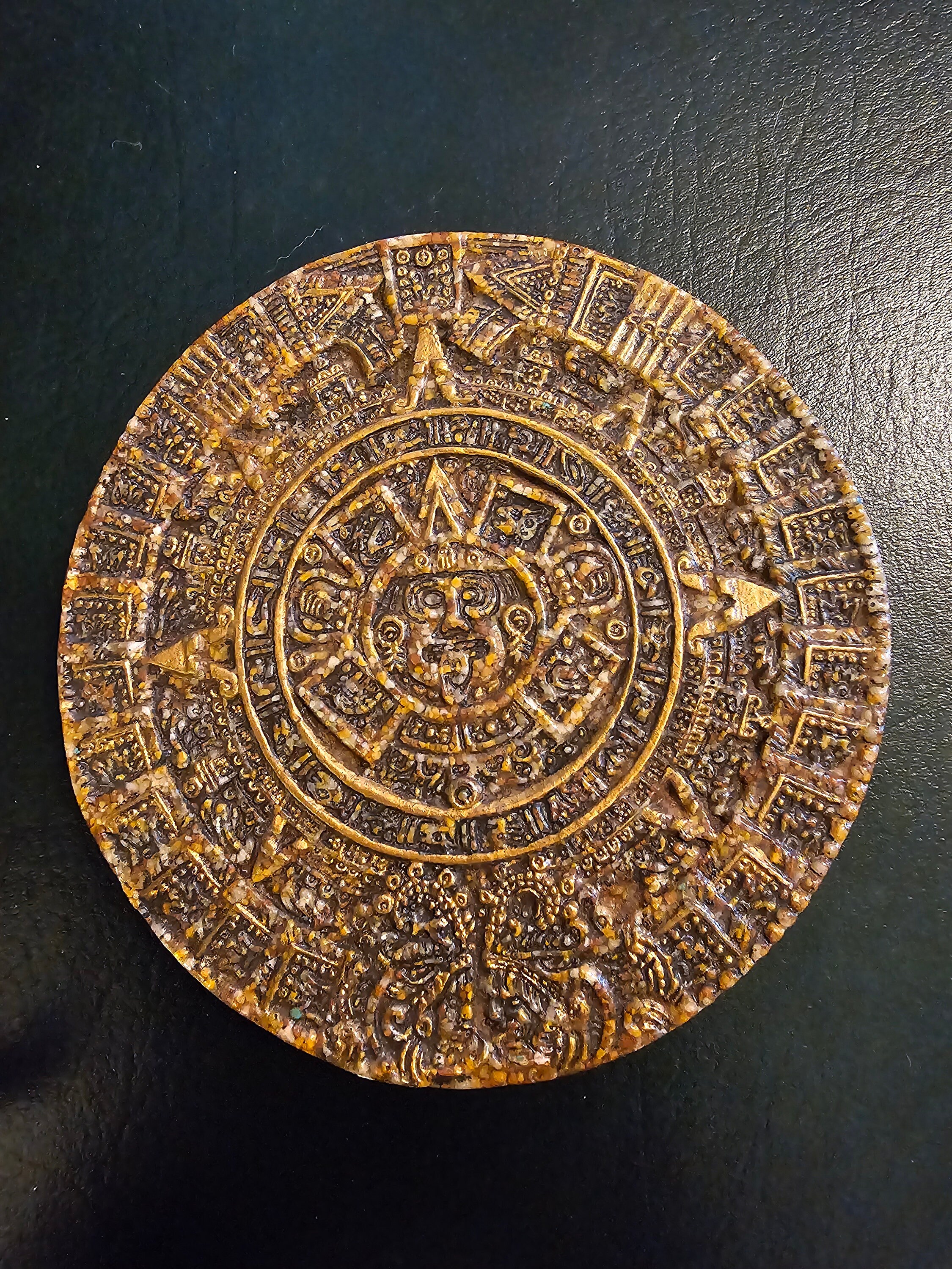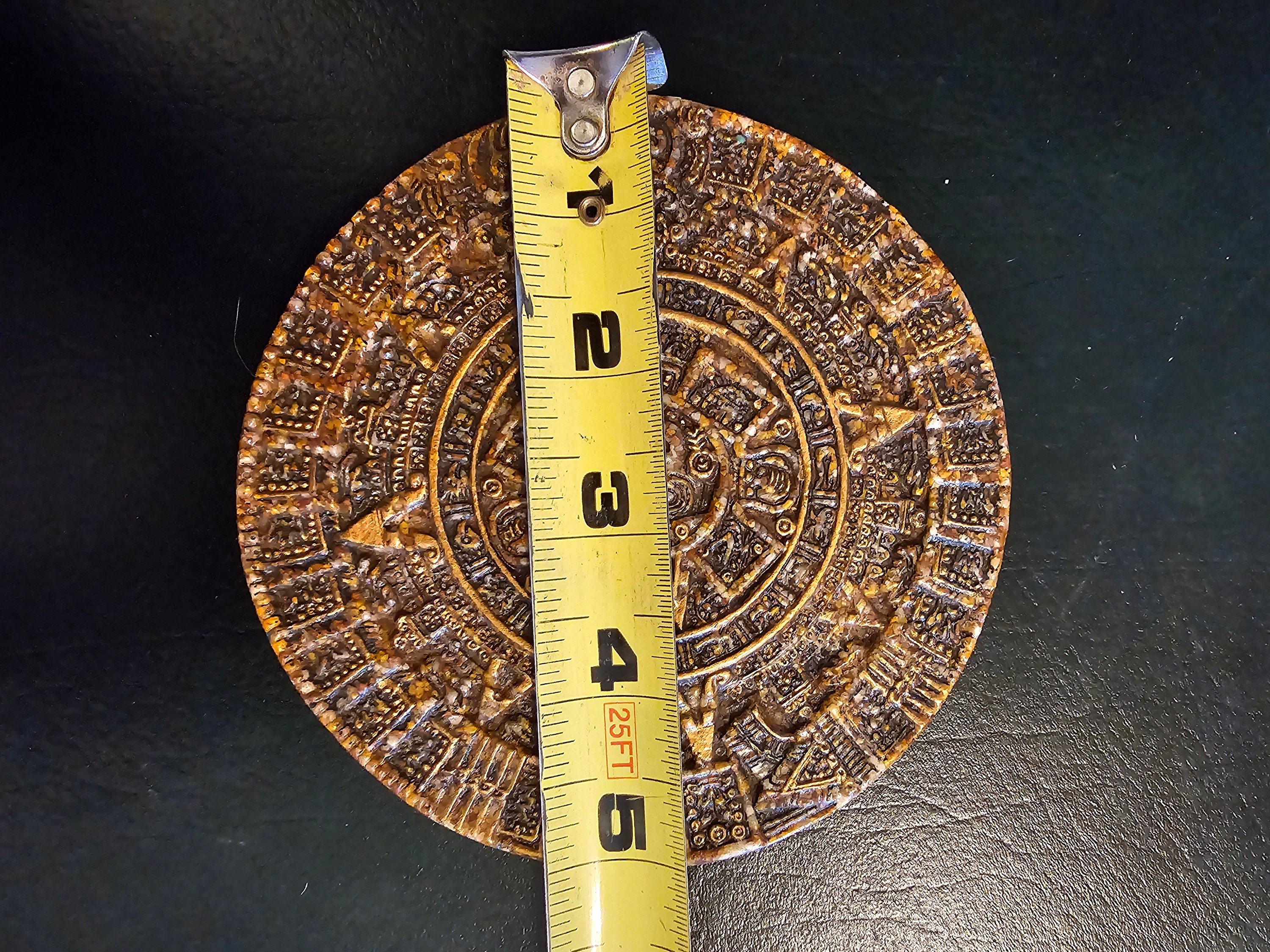 Casting stone Aztec calendar with brass stand. It is 5 inches in diameter and does have a hanger on the back. It can sit on the shelf or hang on the wall. Numbered art replica of the ancient calendar of the Aztec people broght back from Mexico in the 70's.