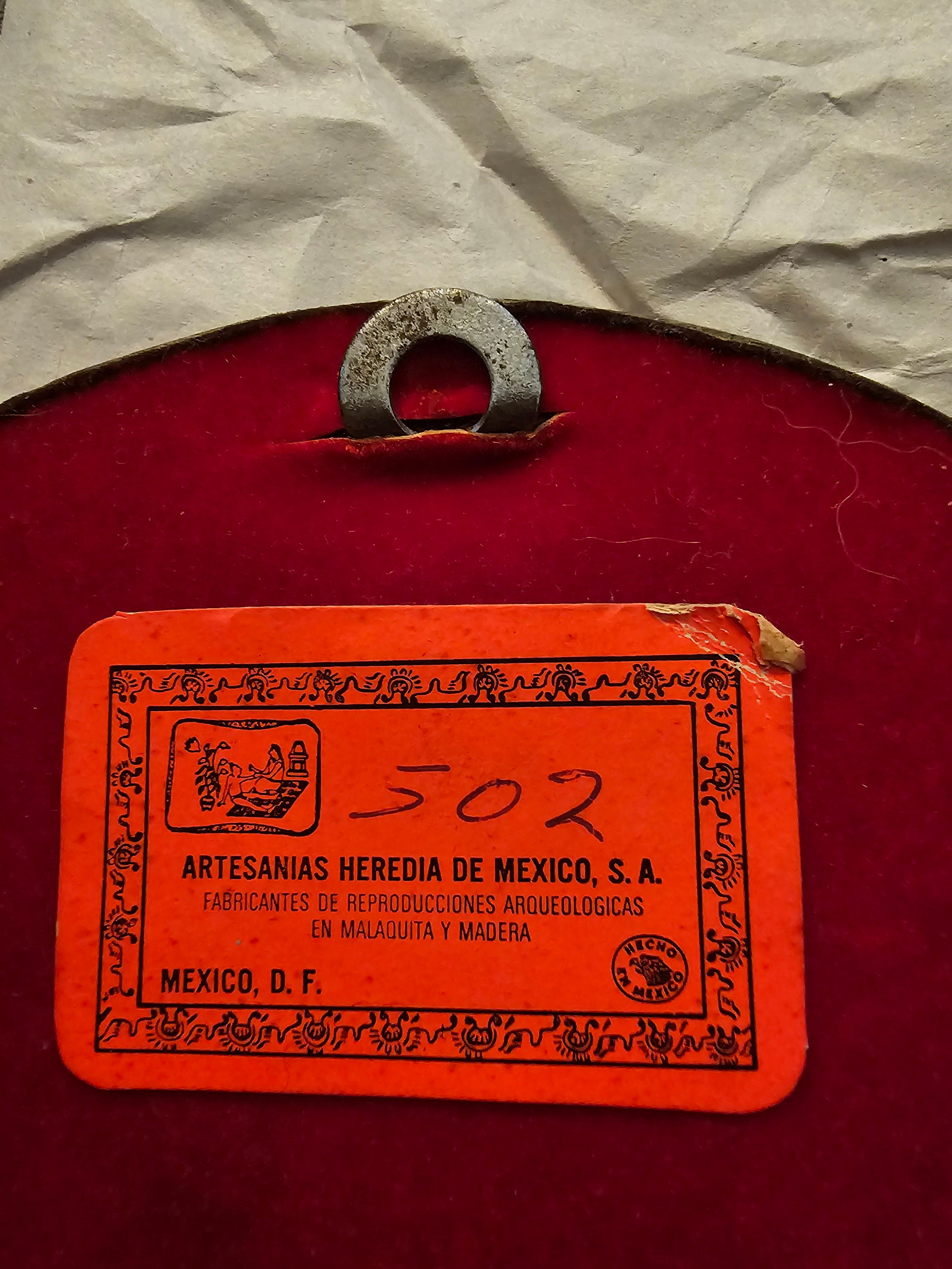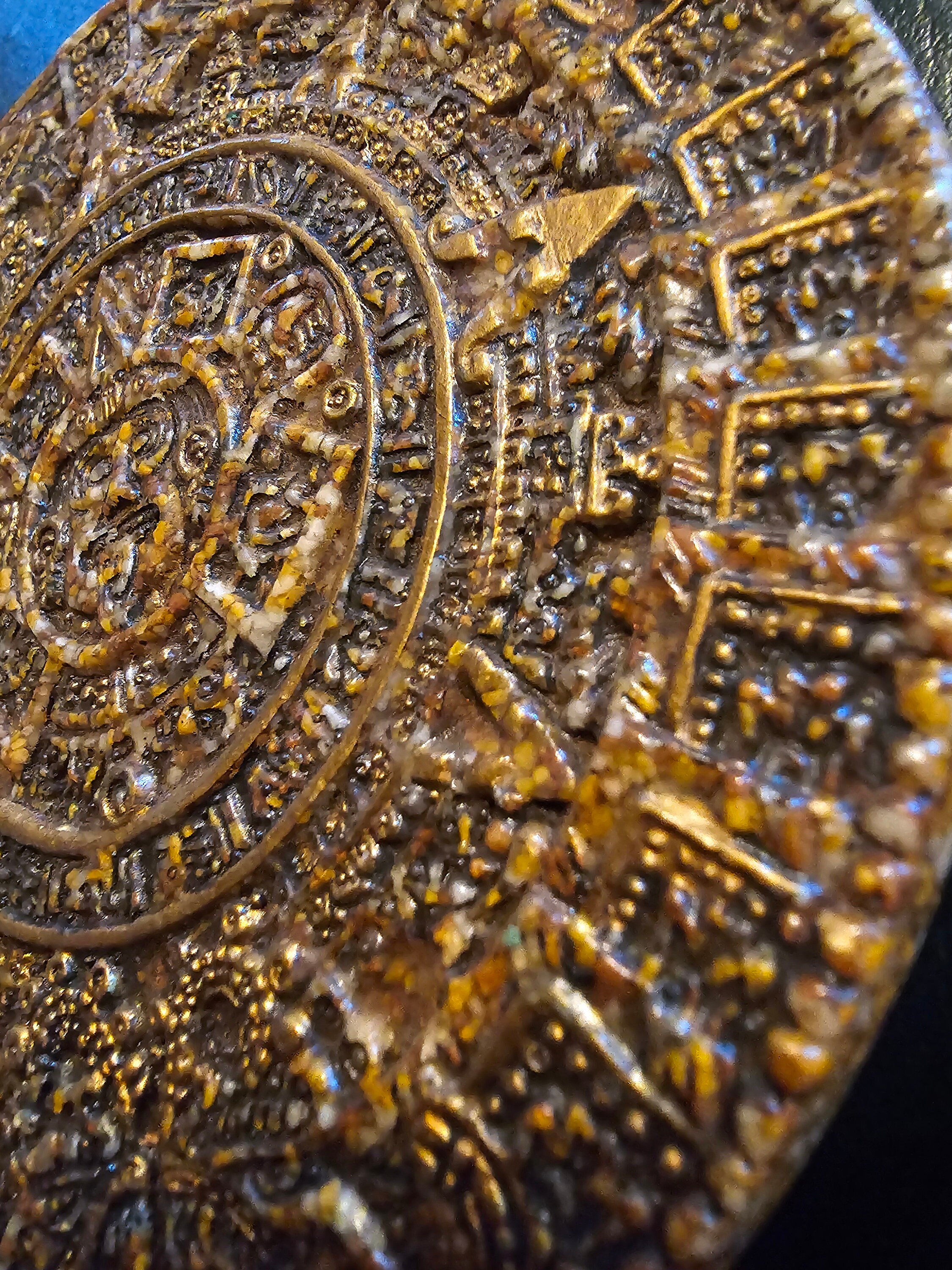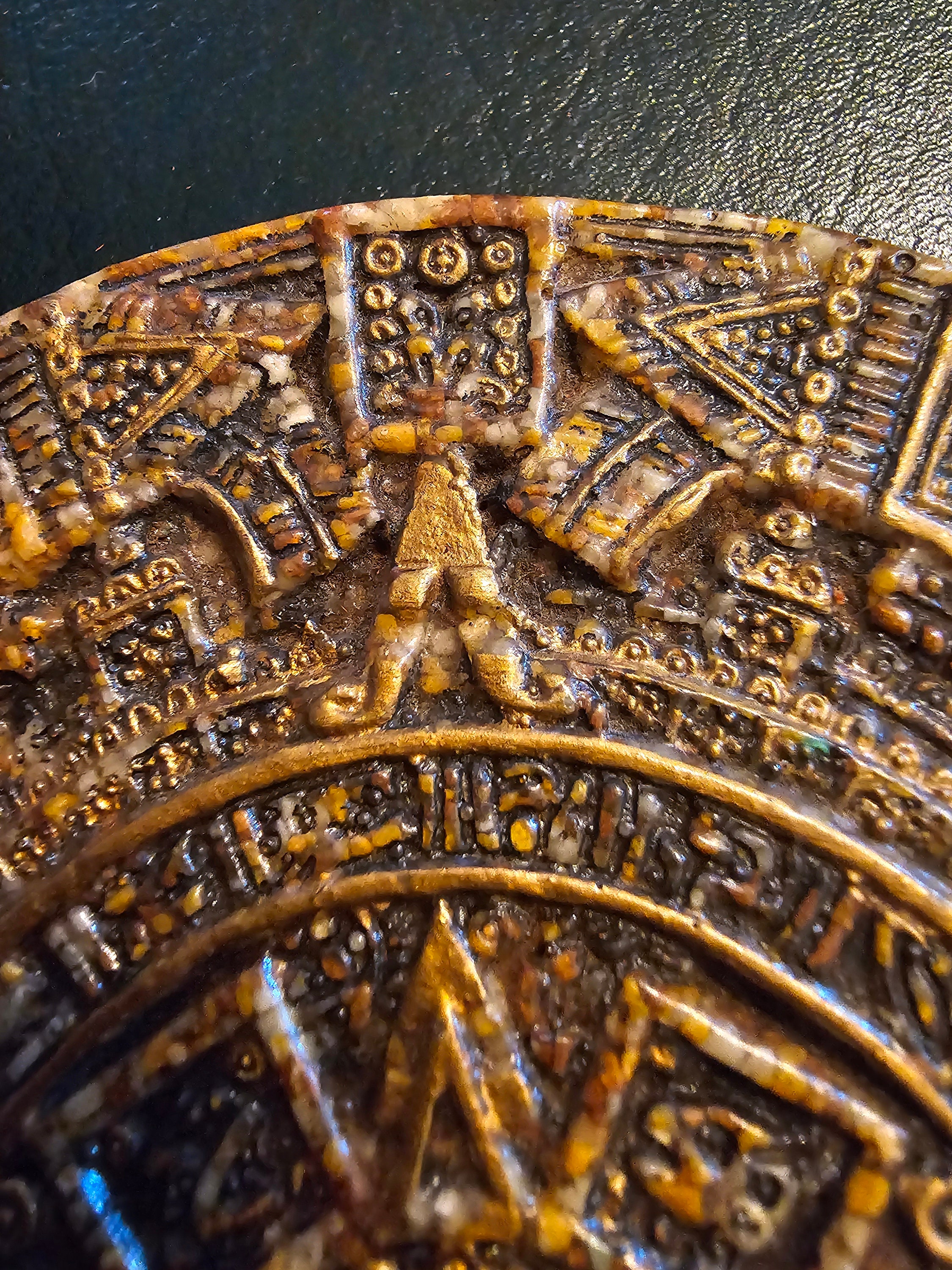 Casting stone Aztec calendar with brass stand. It is 5 inches in diameter and does have a hanger on the back. It can sit on the shelf or hang on the wall. Numbered art replica of the ancient calendar of the Aztec people broght back from Mexico in the 70's.