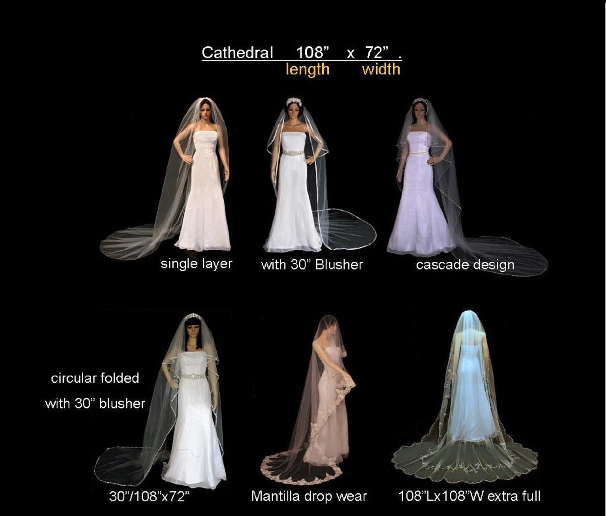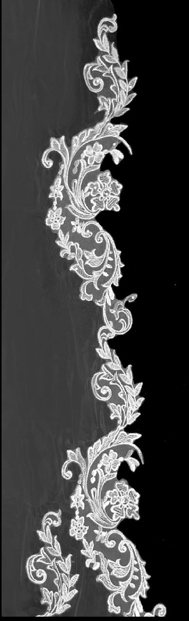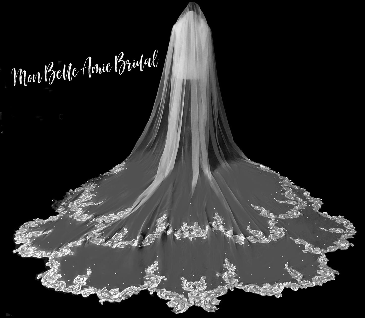 Dramatic lace veil with unique design; rhinestone accents. 34 inches from comb to lace, 144 inches from comb to bottom edge, 38 inches edge to top peak of lace.