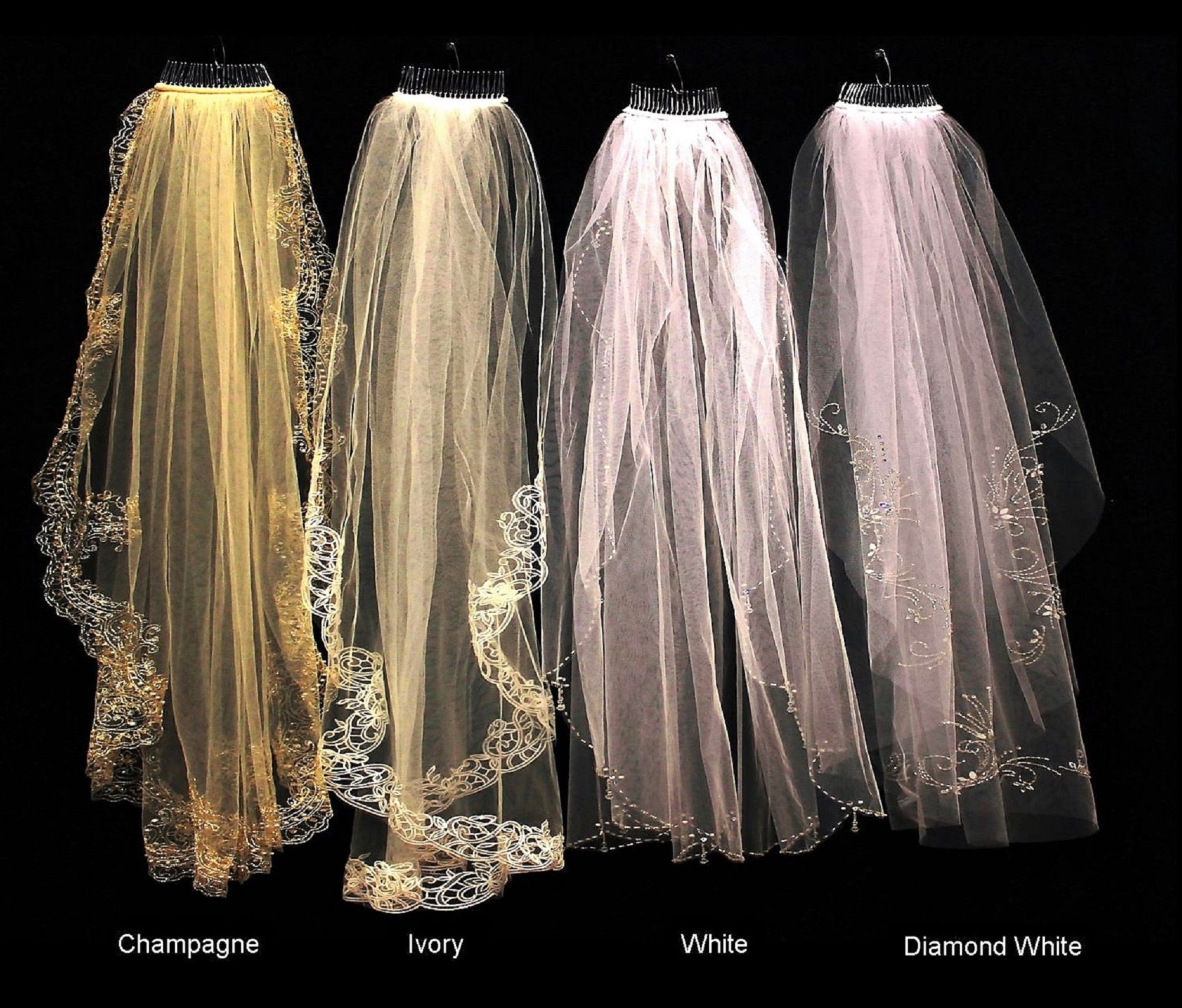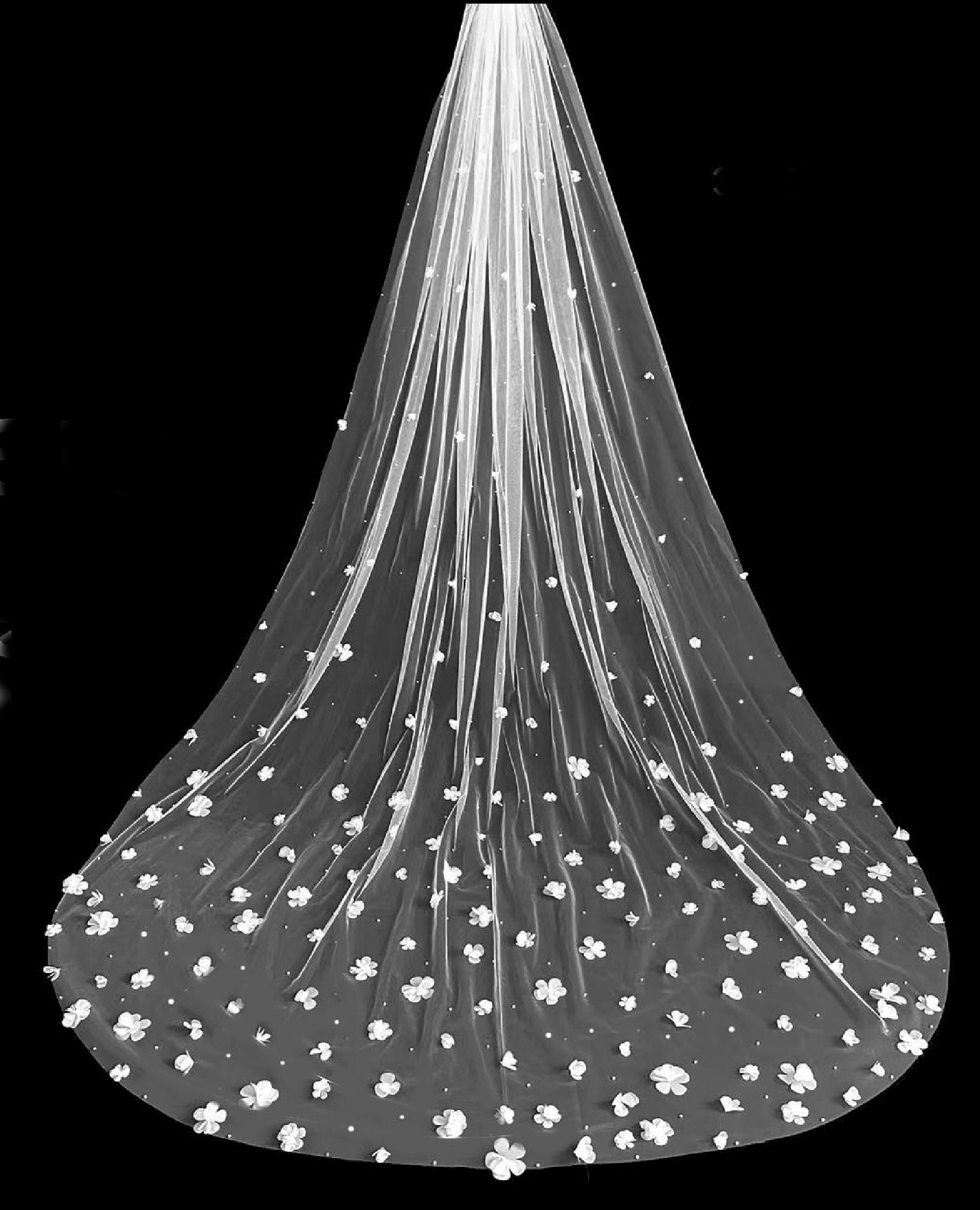3D organze flowers scattered over the bottom portion of the 120 inch length veil and then scattered with either pearls or rhinestones. 120 x 90 inch.