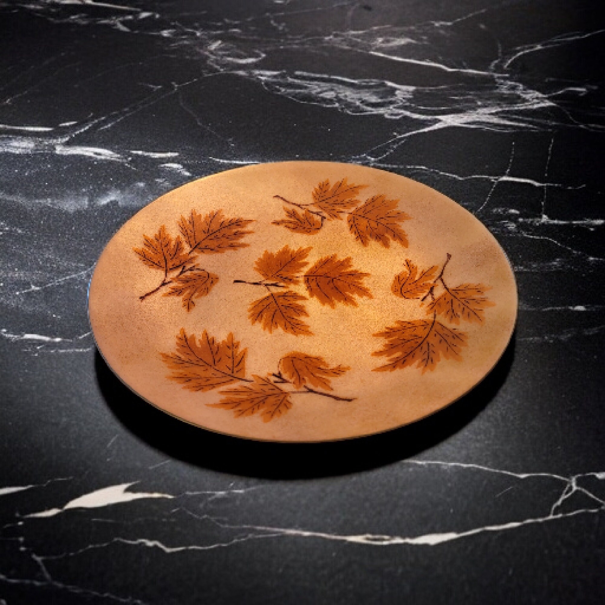 This vintage copper enamel plate/shallow bowl is a true work of art created by the master artisan Annemarie Davidson. The plate features a stunning leaf design with rich hues that are sure to catch the eye and add a touch of vintage elegance to any home decor.