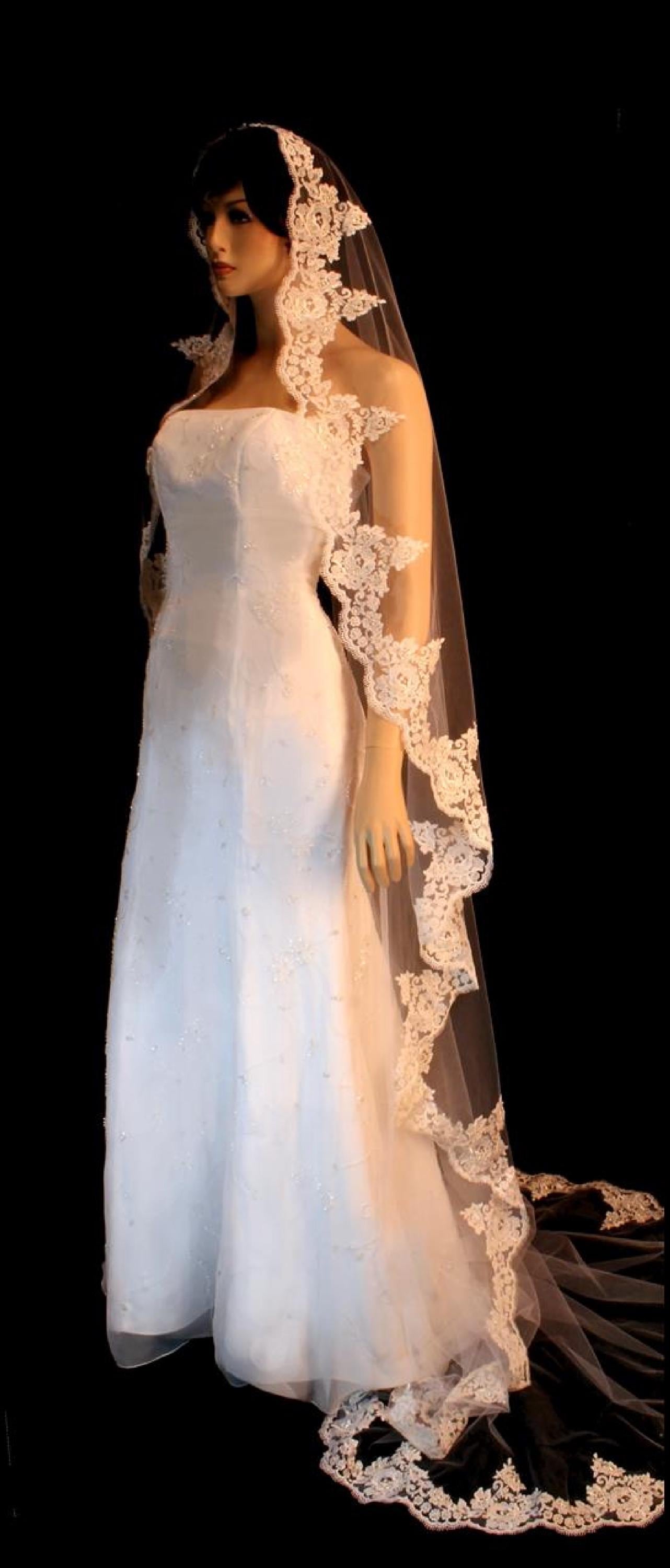 Alencon Lace Regal Length Mantilla Wedding Veil: Rhinestone & Silver Beaded Trim