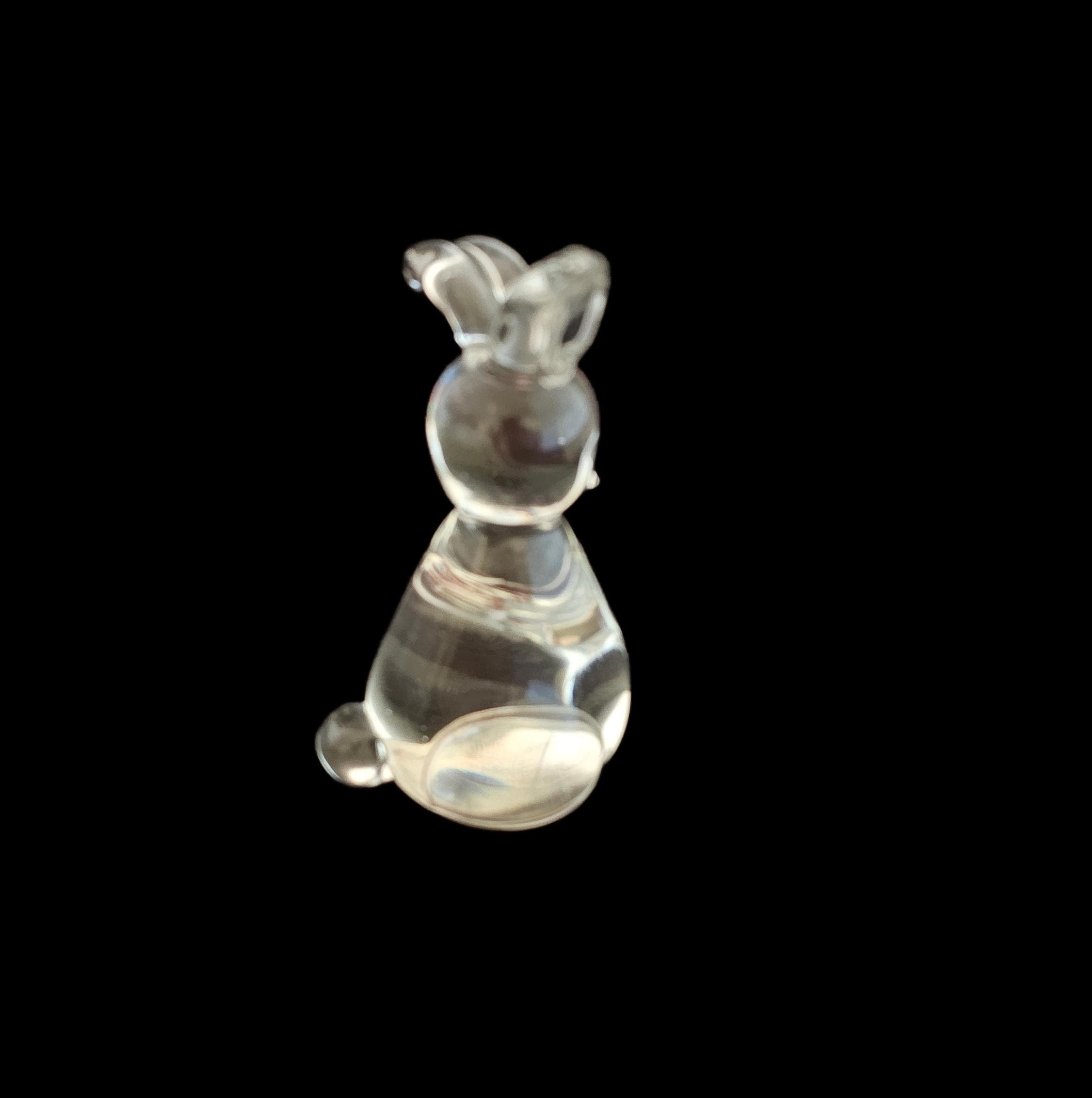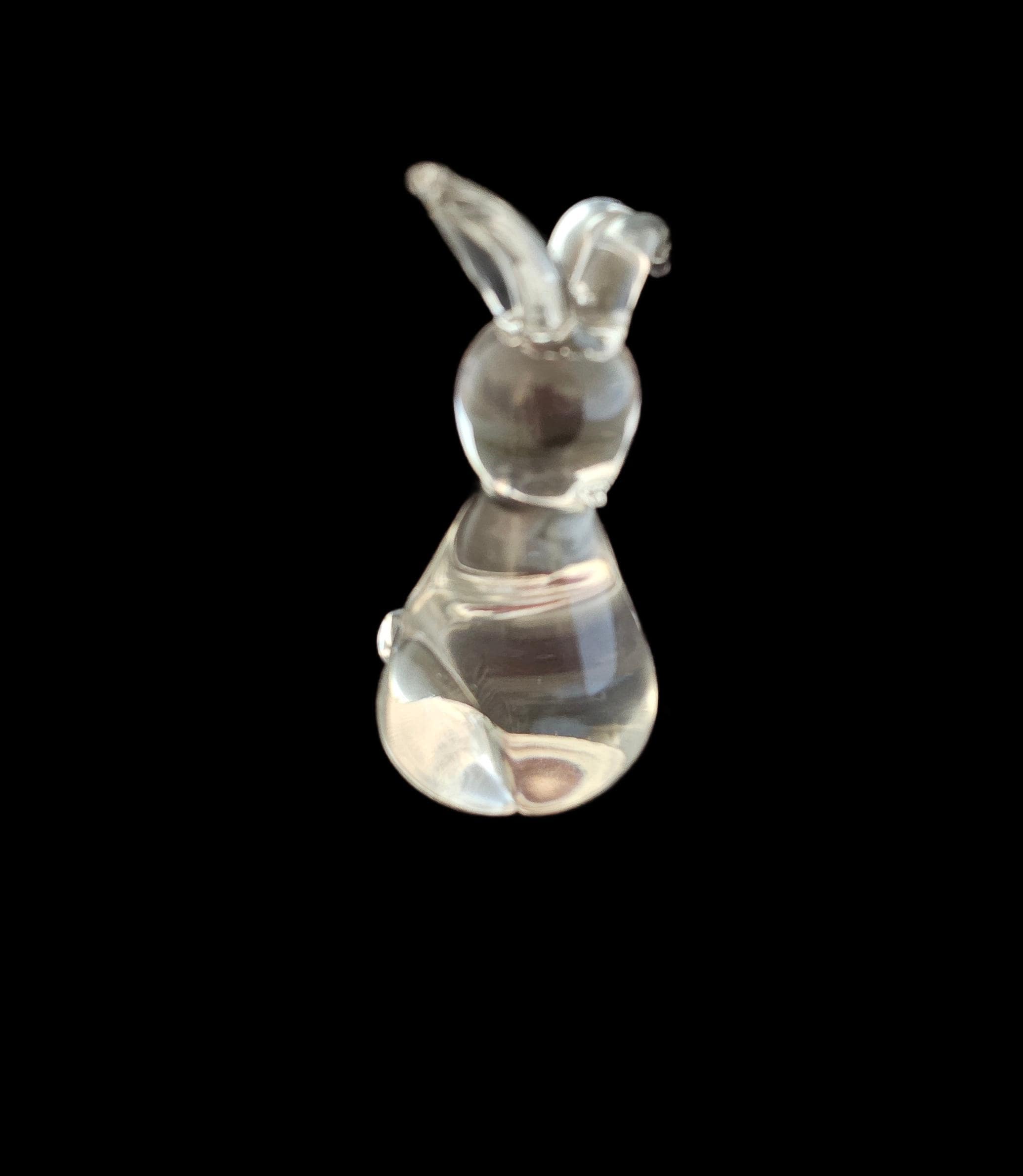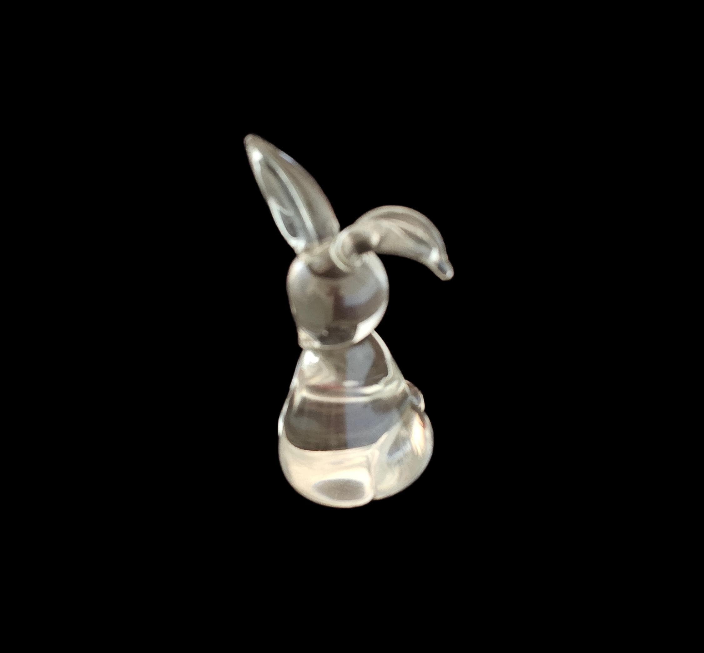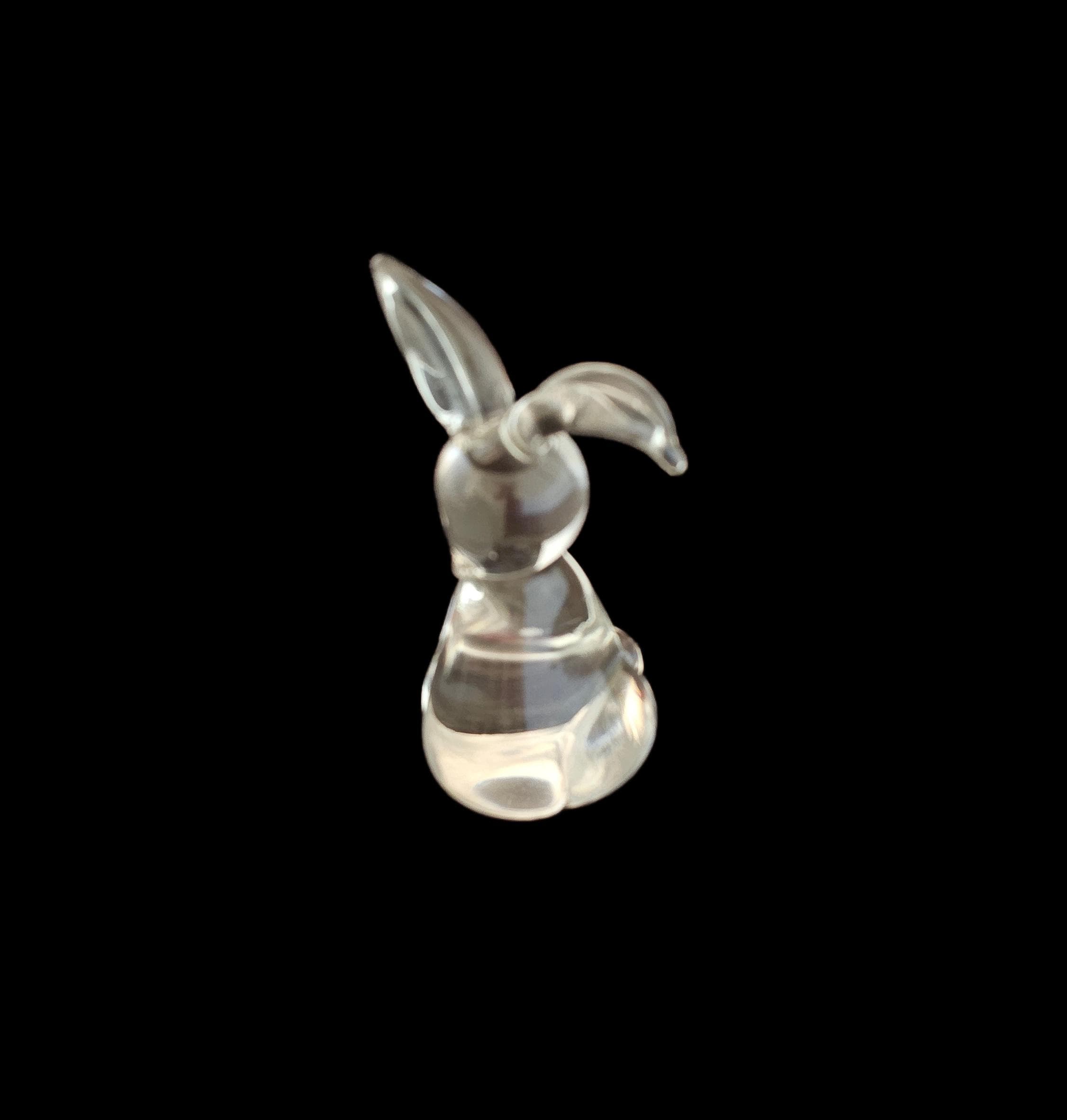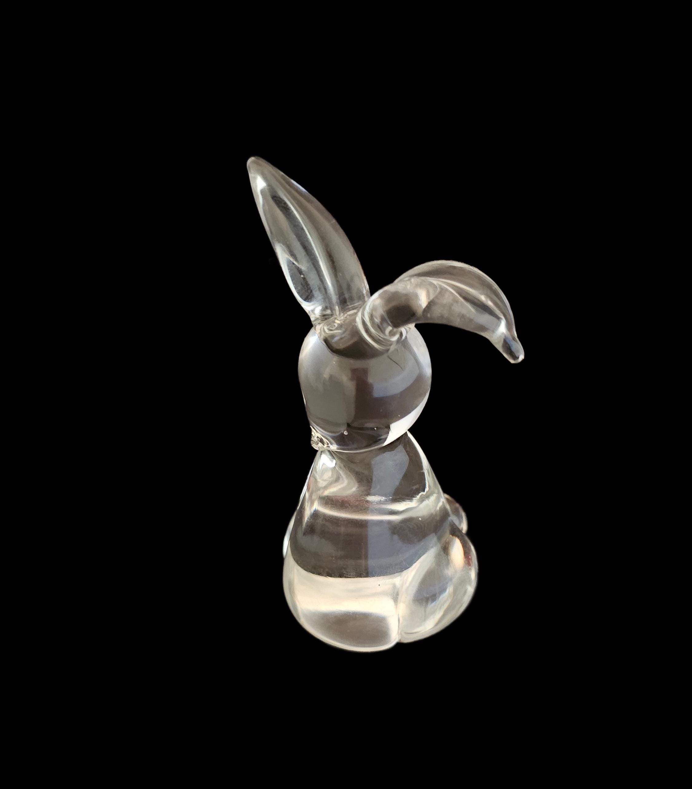 This versatile item can serve as a decoratie piece or a functional paperweight. It is of quality crystal and is a stylized, minimalist design with long ears and a rounded body.
