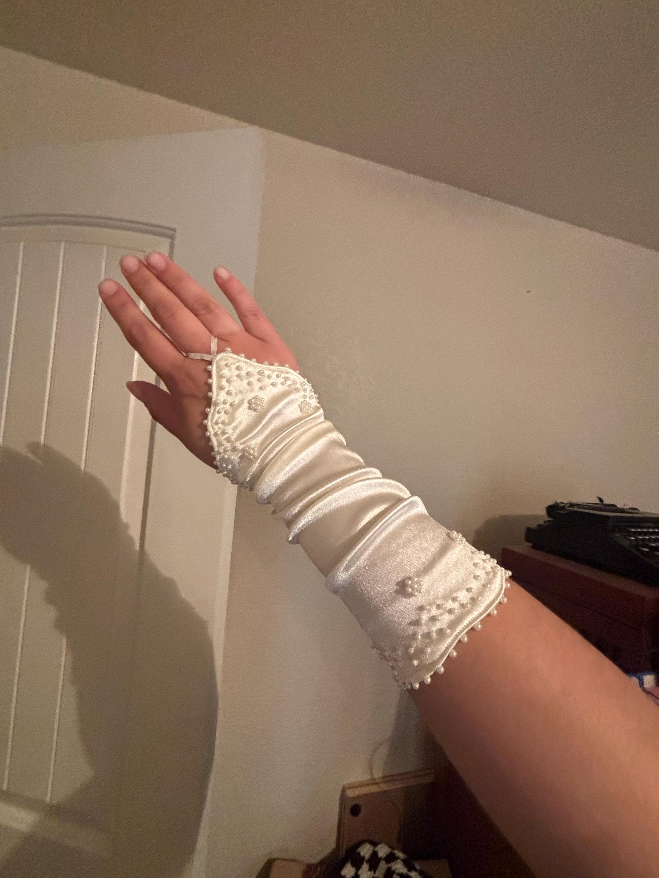 The shipping was great, the gloves were beautiful, but they’re a very deep ivory. They’re not white ivory, they’re more of a yellow ivory and I was not expecting that. I wish there were more photos or reviews to have shown this. They’re very pretty gloves, but I did not want yellow ivory gloves and they’re also pretty short and not long like I thought they would be.